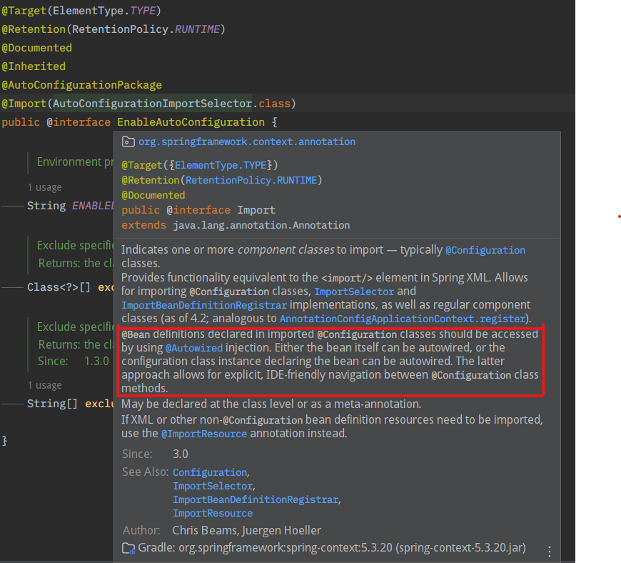 一个疑问 - 有些bean 看起来并没有被component标记,但是仍然可以使用autowired注入 例如:JavaMailSender 本身并没有被 component 标记,怎么可以使用 autowired 注入 答案在以下截图